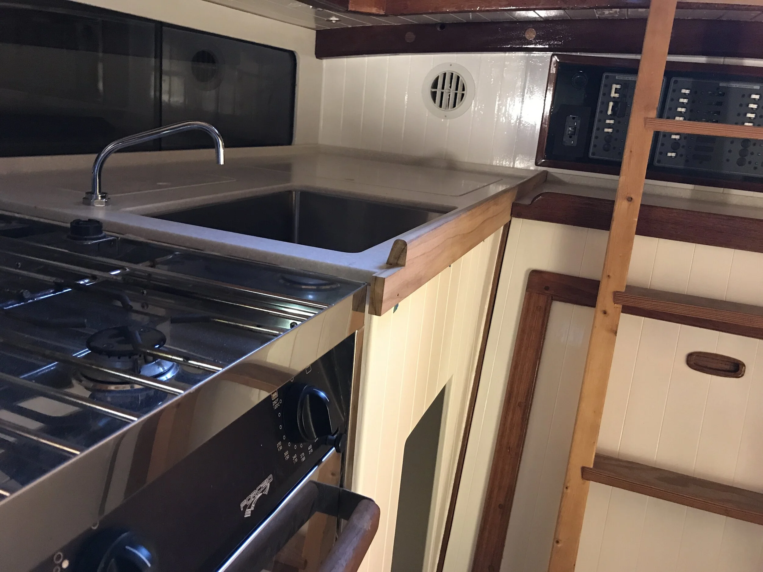 Counters, sink, stove, instrument panel, ladder, engine face . . . Whose boat IS this???