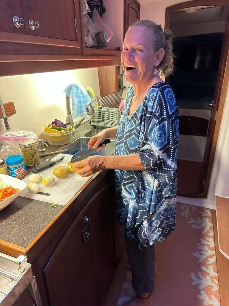 Cooking dinner aboard Boundless (Photo credit Samantha Wells, S/V Boundless)
