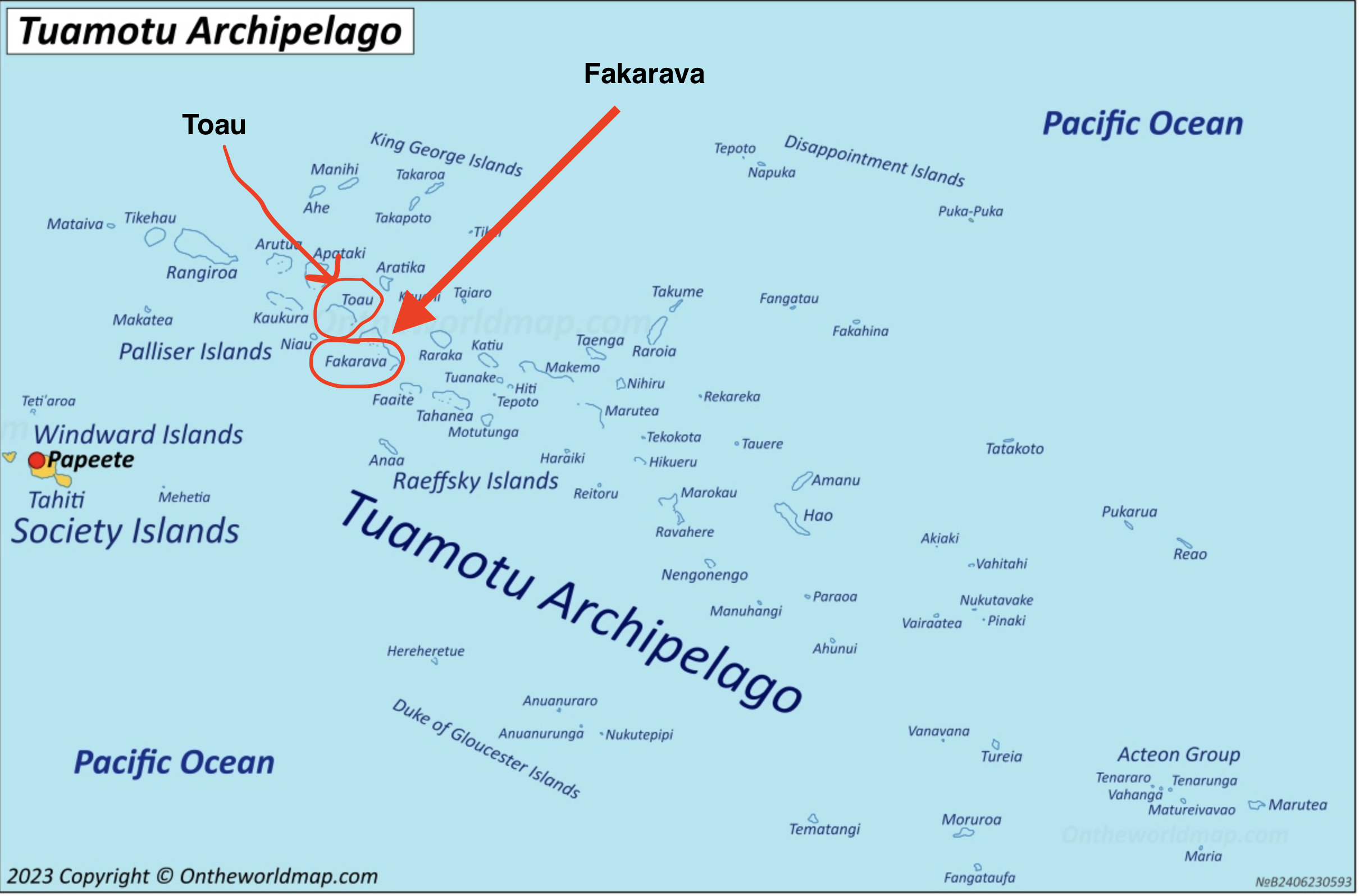 Fakarava and Toau are very close to each other (map from ontheworldmap.com)