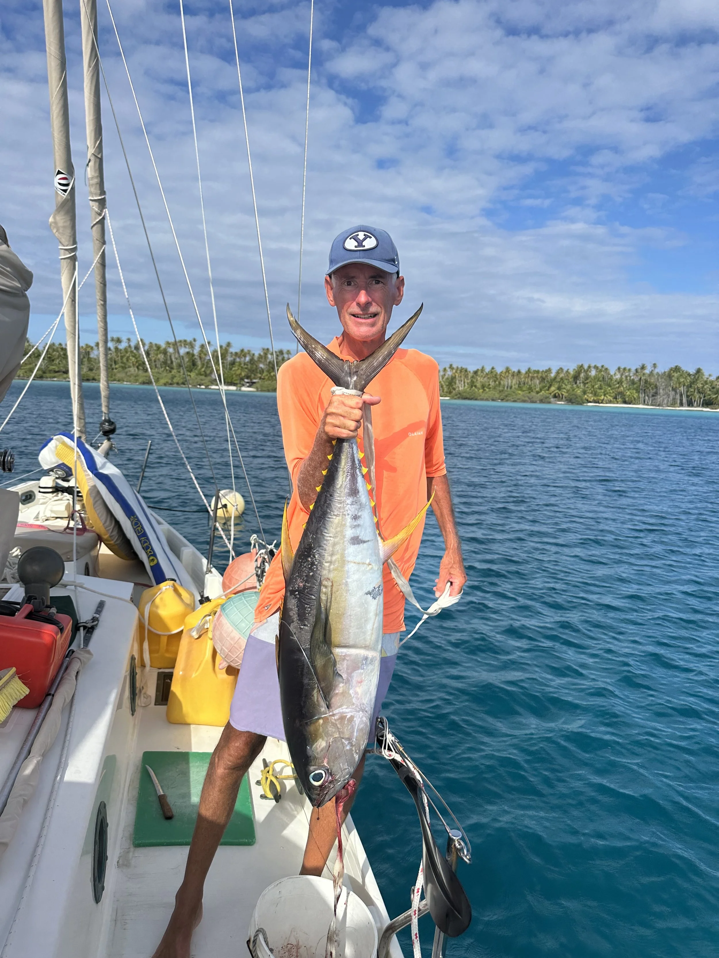 2 tuna. One bonito (not our favorite), and one big yellowfin. Jeremy took the bonito ashore to gift it to the man who lives here, then came back and spent the next 2 hours processing the yellowfin. There are probably 6 pounds of beautiful tuna in the fridge - and all our boat neighbors were handed bags of ready to cook fish. Not having a freezer means you get to play Santa Claus sometimes.