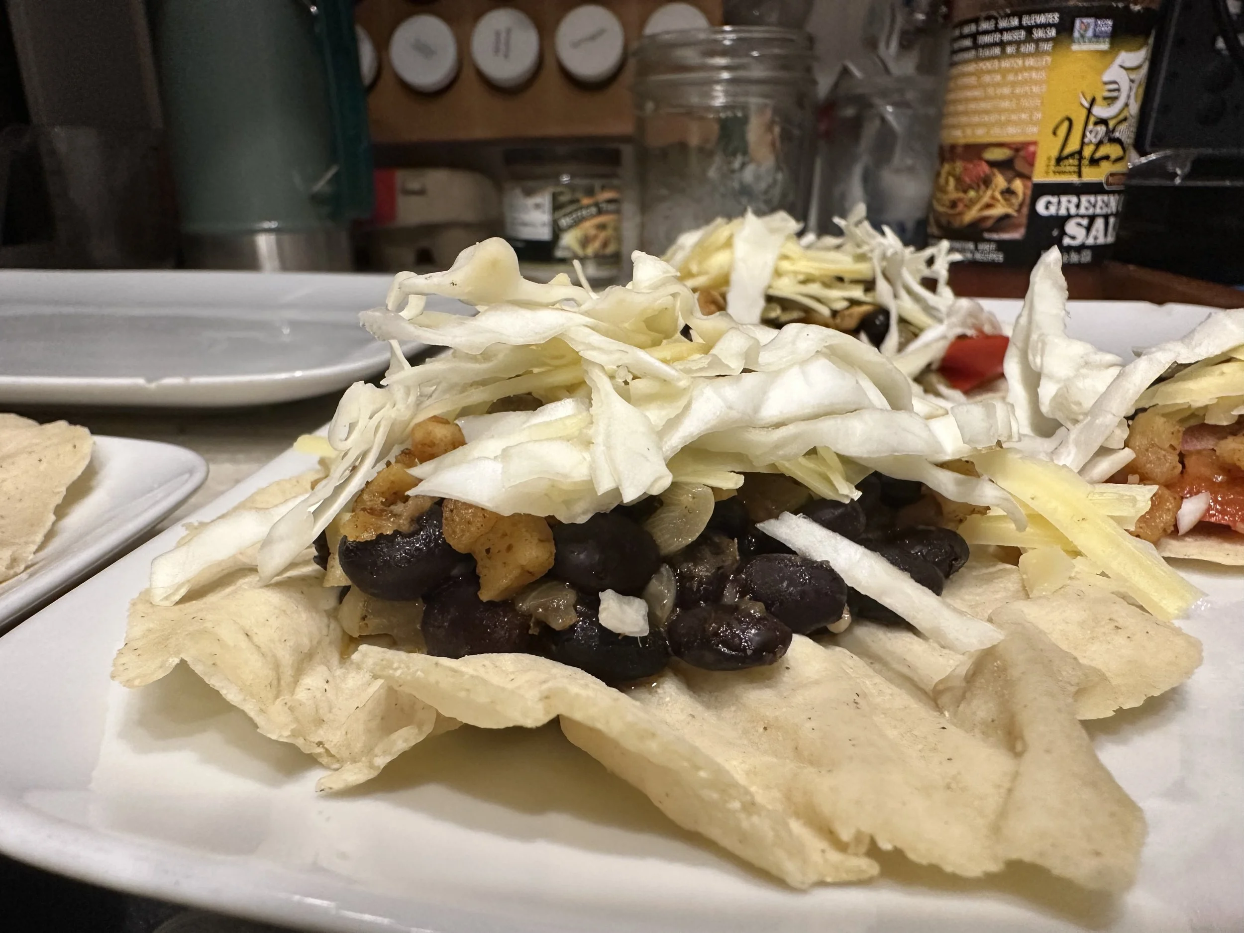 Black beans: 2 cups of cooked black beans (1 can, or 1/2 c dried beans you’ve cooked to done-ness). Sauté chopped onion in a splash of olive oil. Maybe add some chopped green or colored peppers. Cook these until they’re soft, then stir in some chopped garlic. Let that cook until it smells amazing. Add in cumin, oregano, paprika. Stir that around. Splash in worcestershire sauce (optional) and a glug of cider or red wine vinegar, and let it cook down for 30 seconds or so. Stir in the beans and then maybe a cup of water. Simmer for a while, covered, stirring every now and then.