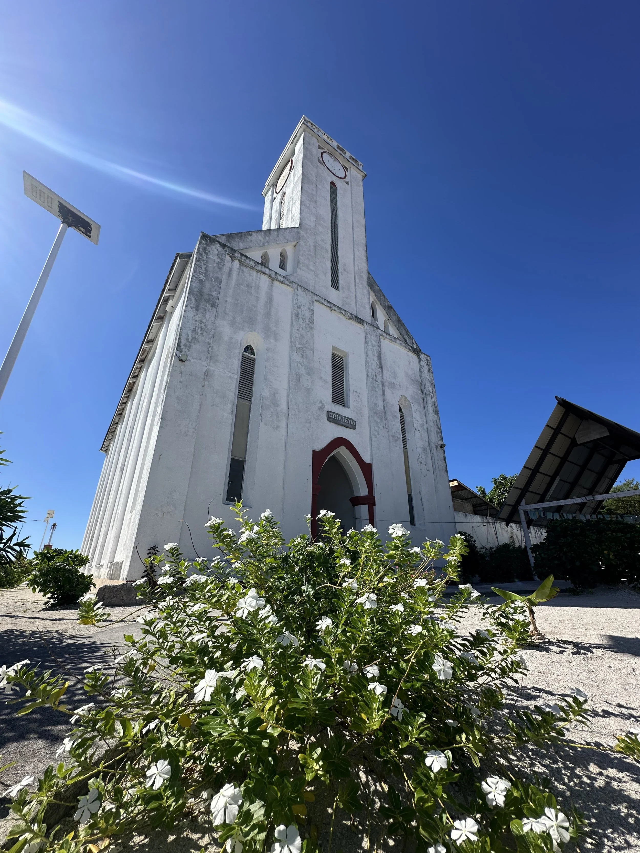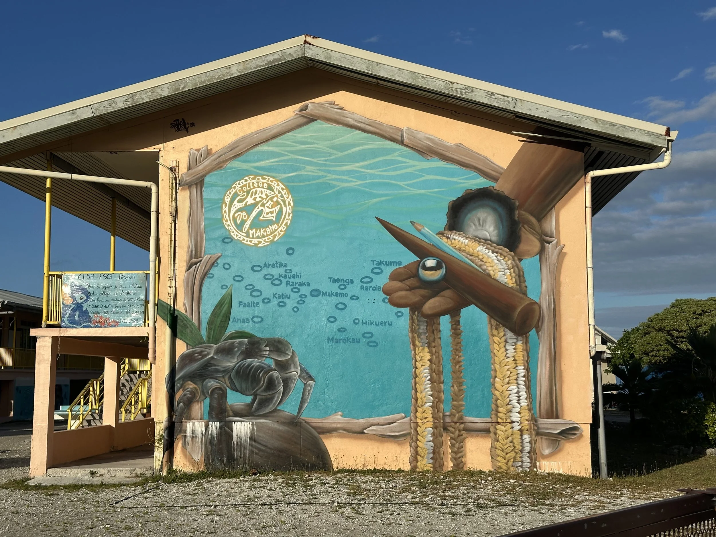 Makemo is one of the larger atolls, both in terms of geographic size but also population. About 1000 people live here, making it maybe the 4th most populated in the whole archipelago. There are multiple options for grocery stores, a few only-open-for-dinner “snacks” (a less formal restaurant of sorts), at least 3 churches, and the College, the after-age-10 school for all kids within the multi-atoll jurisdiction, which covers 12 inhabited atolls. Can you imagine sending your kids away to school starting at age 10? After they turn 15, everyone goes to Tahiti for further schooling. It appears to be more prosperous than Raroia, with painted concrete low walls separating properties, and the same open feeling. This is the first atoll where we’ve seen evidence of boat building.