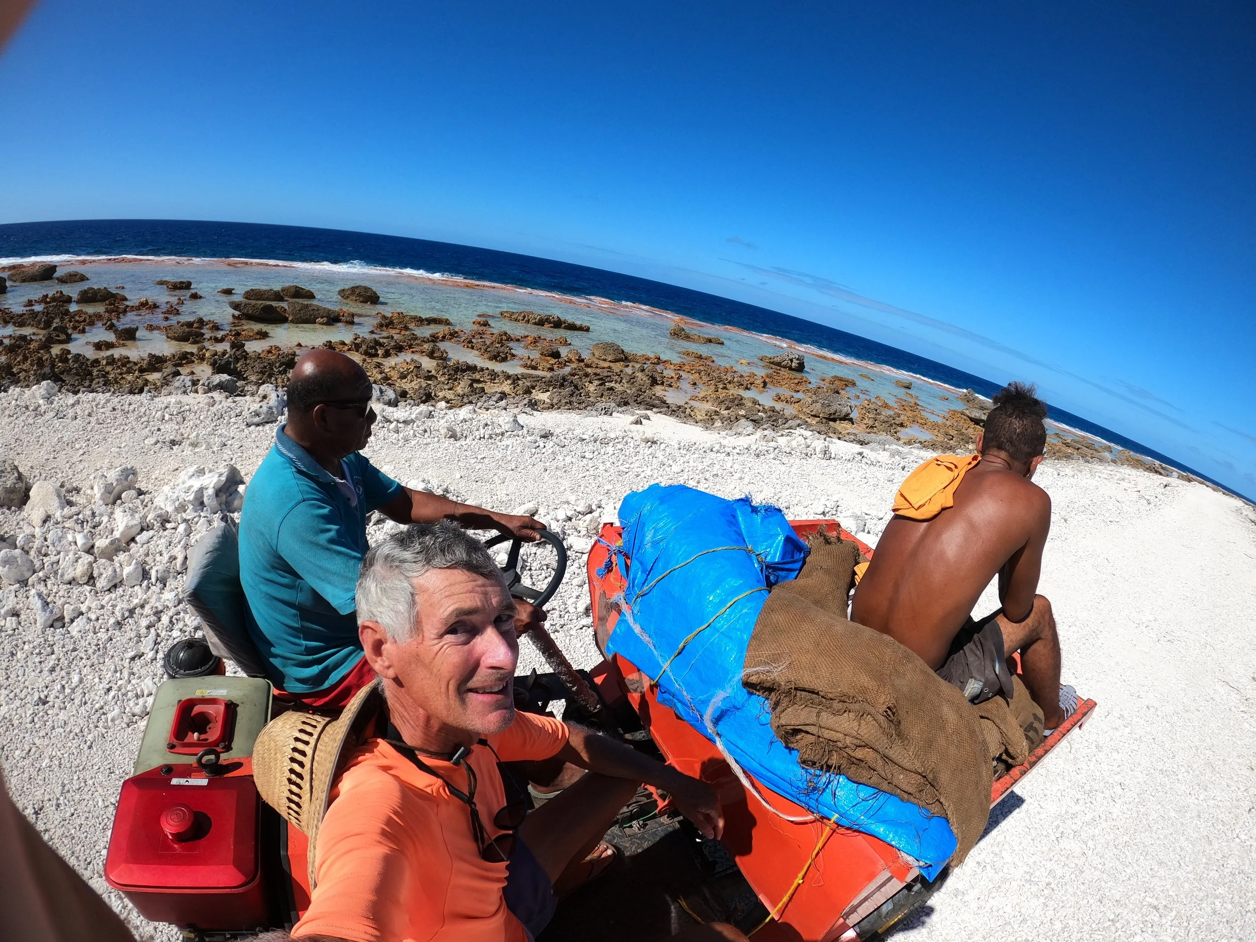 In the morning, chased off by incoming weather, we picked up the anchor to go to anchorage #3 where we spent the most time; it’s also where there were the most boats (7 total) sharing the (abundant) space. The eastern end of Makemo reminds us of the Bahamas, with wide swaths of sandy bottom with 10-20 feet. We found space in 10 feet of depth with plenty of clear room for a full 360 degree turn if needed. This anchorage is near a couple of copra groves and was the first truly active copra production we found. Jeremy met one couple, Gabriel and Lorenza, who asked if we’d mind charging their cell phones since they needed to contact someone in town to arrange a boat to pick up the product they had ready, and we think also to take them back to town, where they have a house and live when they’re not actively working the copra. On one of Jeremy’s visits, he got a ride on their little 4x4 along the copra highway, a newly constructed road of crushed coral rubble that runs, presumably, all the way to town.