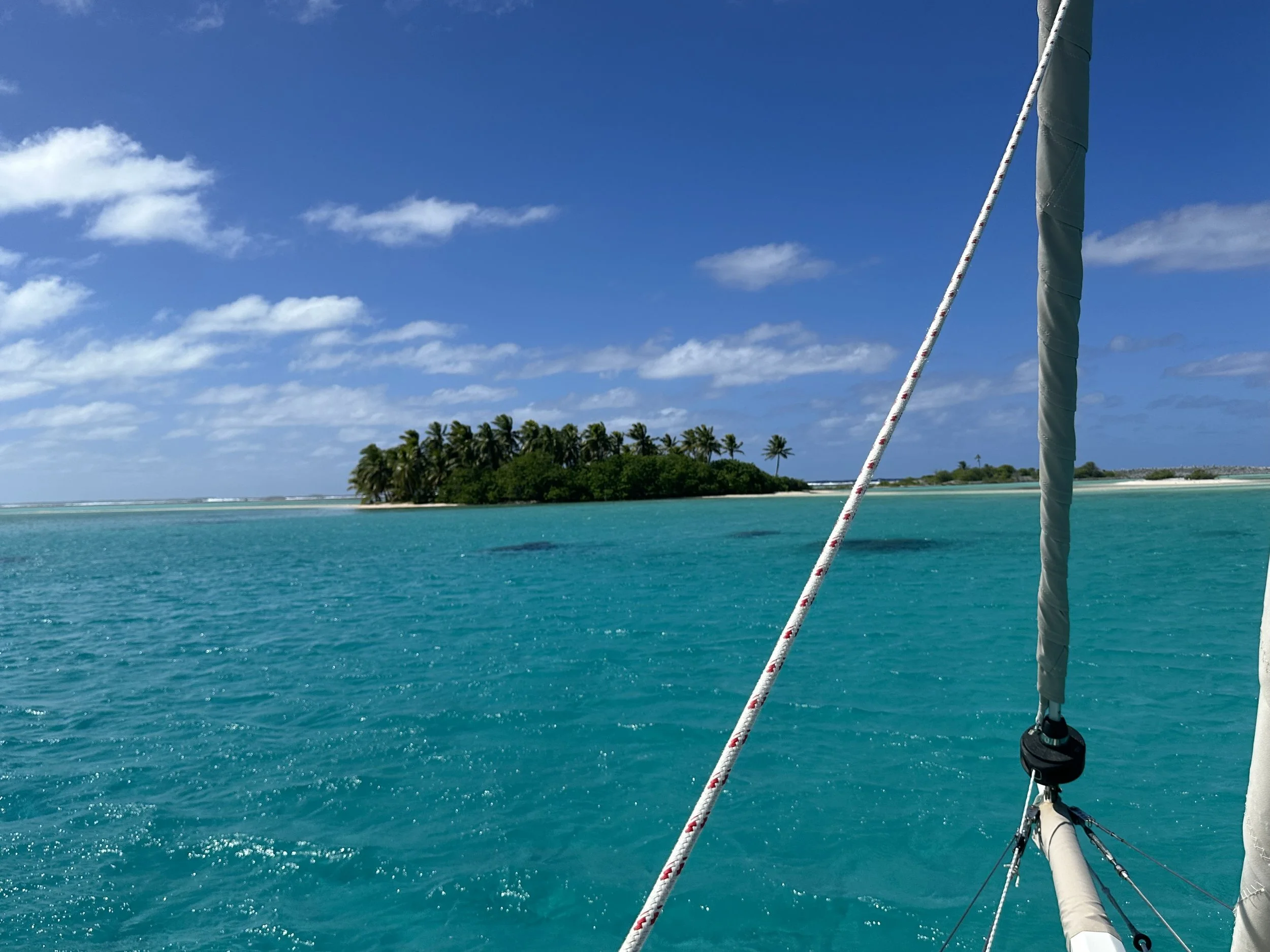 We’d realized that incoming weather, especially the swell forecast, would pin us down where we happened to be for a few days, and we decided it was time to head to Katiu. Timing of this next passage was especially important between leaving Makemo and sailing the 30 miles to Katiu, and it all hinged on getting out the pass in Makemo as early as possible. The western pass has no decent anchorage nearby as shown by satellite imagery and affirmed by some reviews of people who had tried. Too deep, too unsheltered, too bommie-strewn. Anchorage #6 was a good 10 miles from the pass, 2 hours that needed to be done after the sun was up. Some careful look at the chart and the satellite images we had showed a good spot that was only 4 miles from the pass. Off we went!