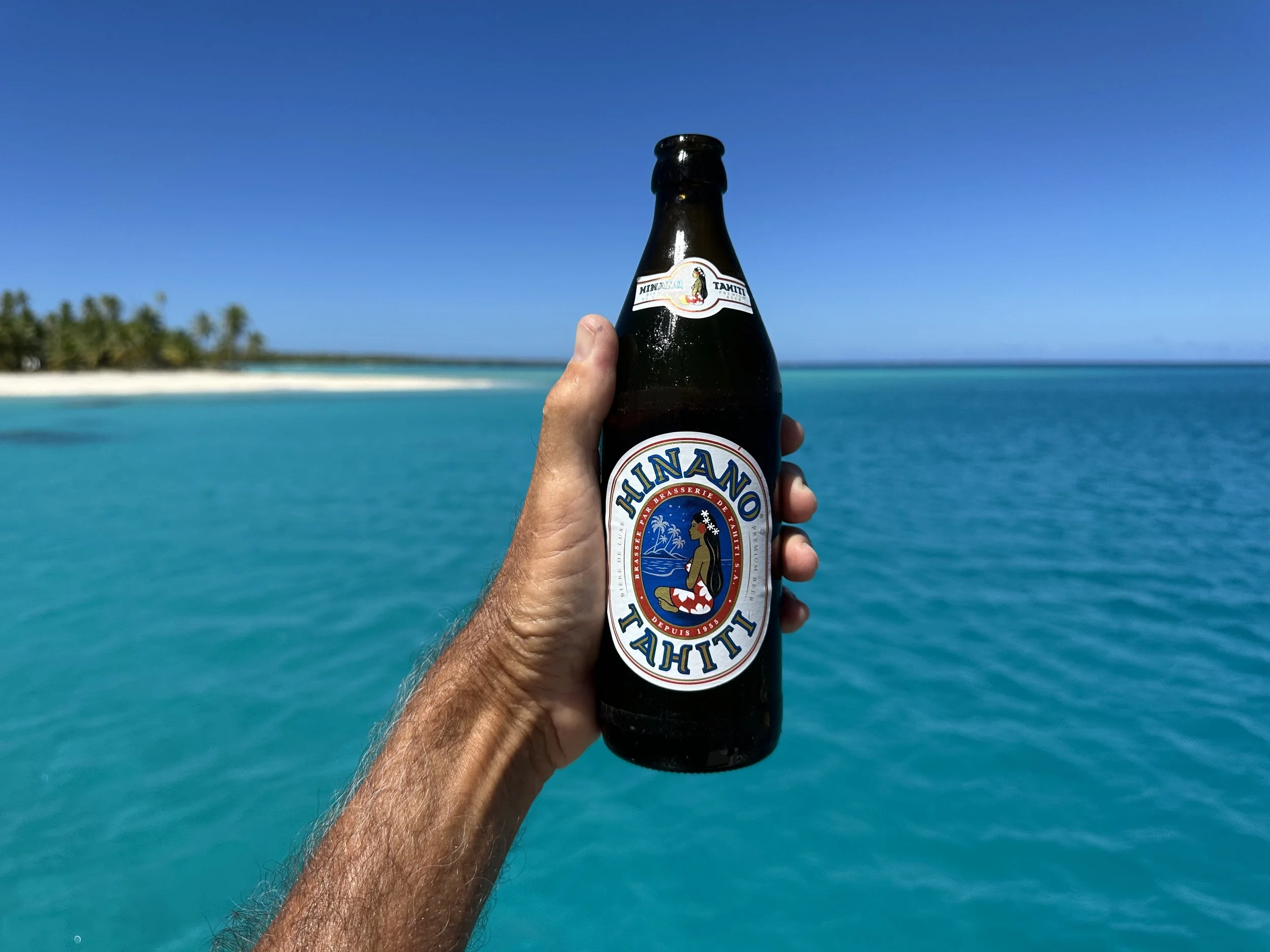 The beer in French Polynesia is Hinano. (You can find Heineken occasionally, and maybe a couple of other beers. We’re Hinano people.) It’s sold in cans or in bottles, in 250 ml or 500 ml sizes. Jeremy’s done the math, and the best deal is the 500 ml bottles (called “obus” here). Buy yourself a case (20 bottles to a case) and go from there.